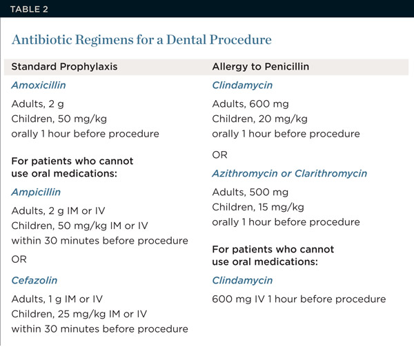 Delay non-urgent and non-infected dental procedures until 3-6. If you are not allergic to penicillin take 2grams of Amoxicillin by mouth one hour prior to your procedure. Amoxycillin 1g or Erythromycin.